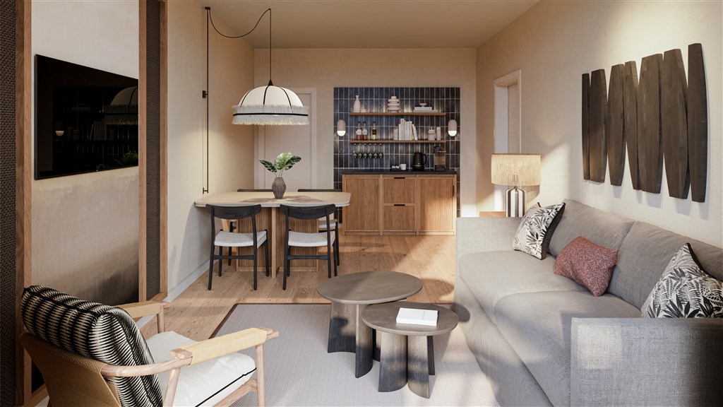 SuiteZákladní vybavení je stejné jako u pokoje Standard, ale je prostornější a obývací část je oddělena od dvoulůžkové ložnice dveřmi.