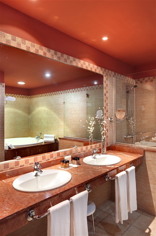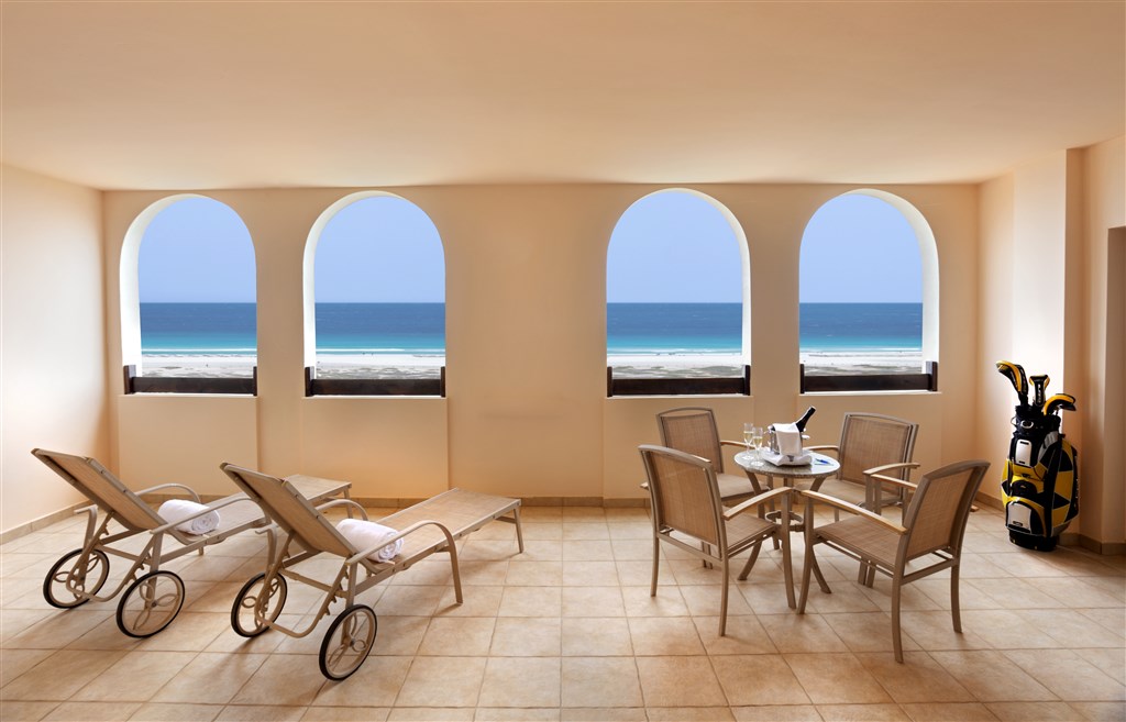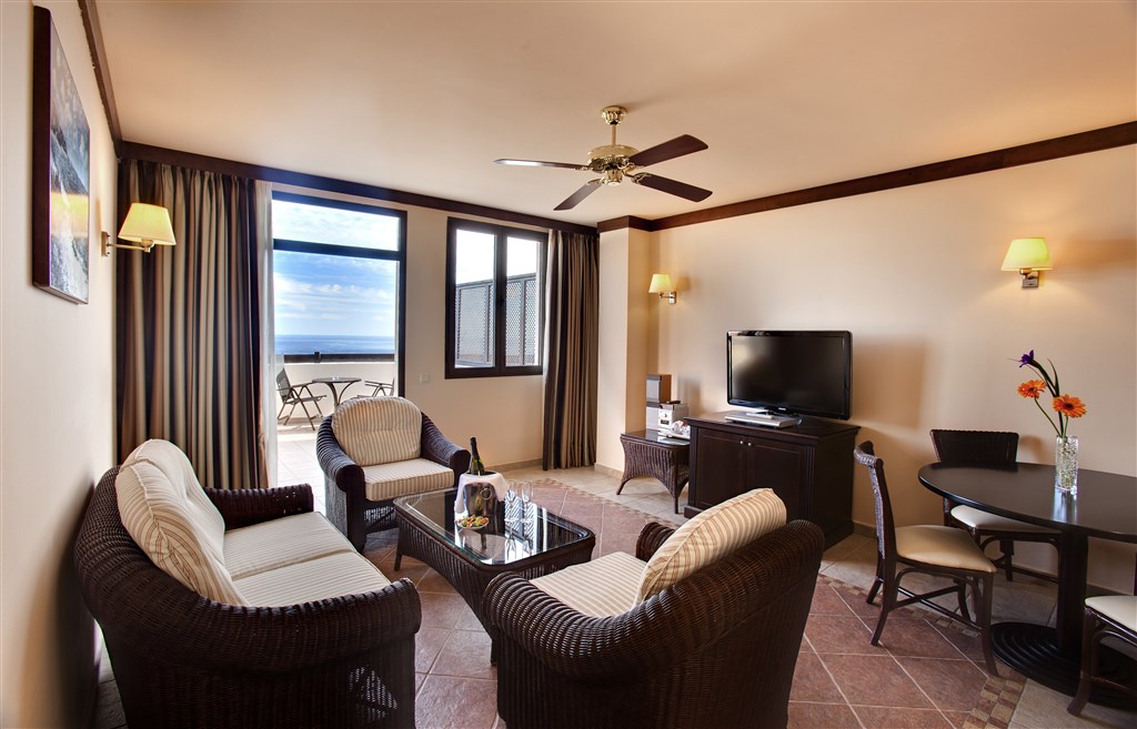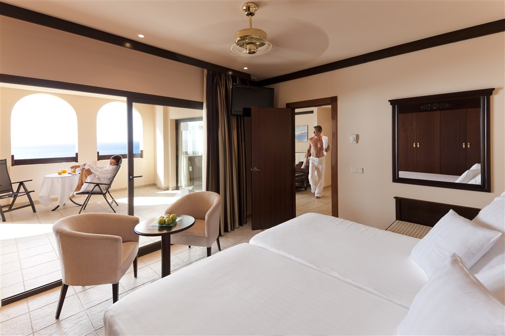 Suite Deluxe s výhledem na moře Základní vybavení je stejné jako u pokoje Deluxe, je prostornější, má samostatnou obývací část a v koupelně hydromasážní vanu.